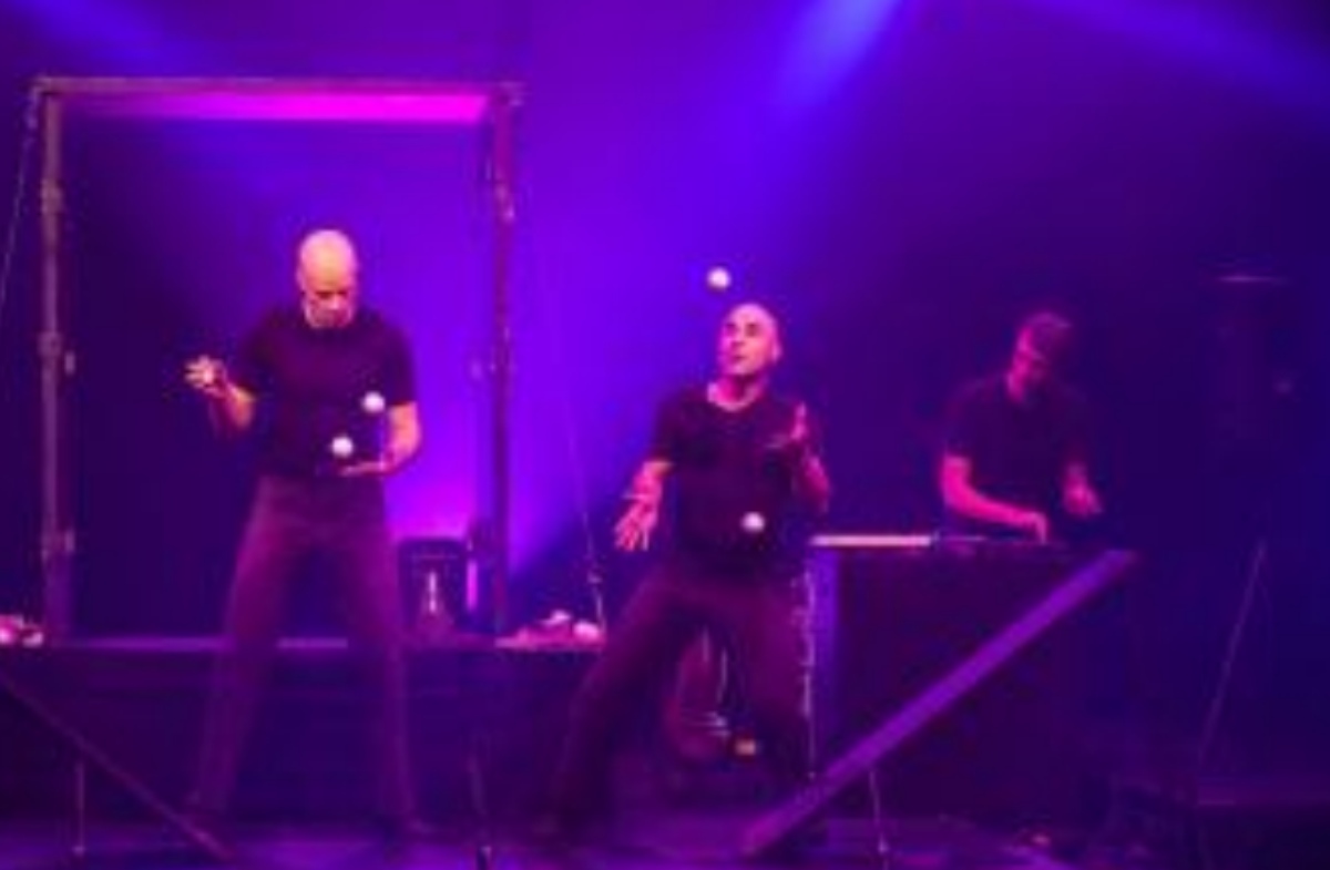 Sur scène : deux body-percussionnistes tout droit sortis d’un cartoon virevoltent aux rythmes complexes des balles martelant le sol, vite rejoints par un musicien multi-instrumentiste dans un généreux délire savamment orchestré et chorégraphié.
