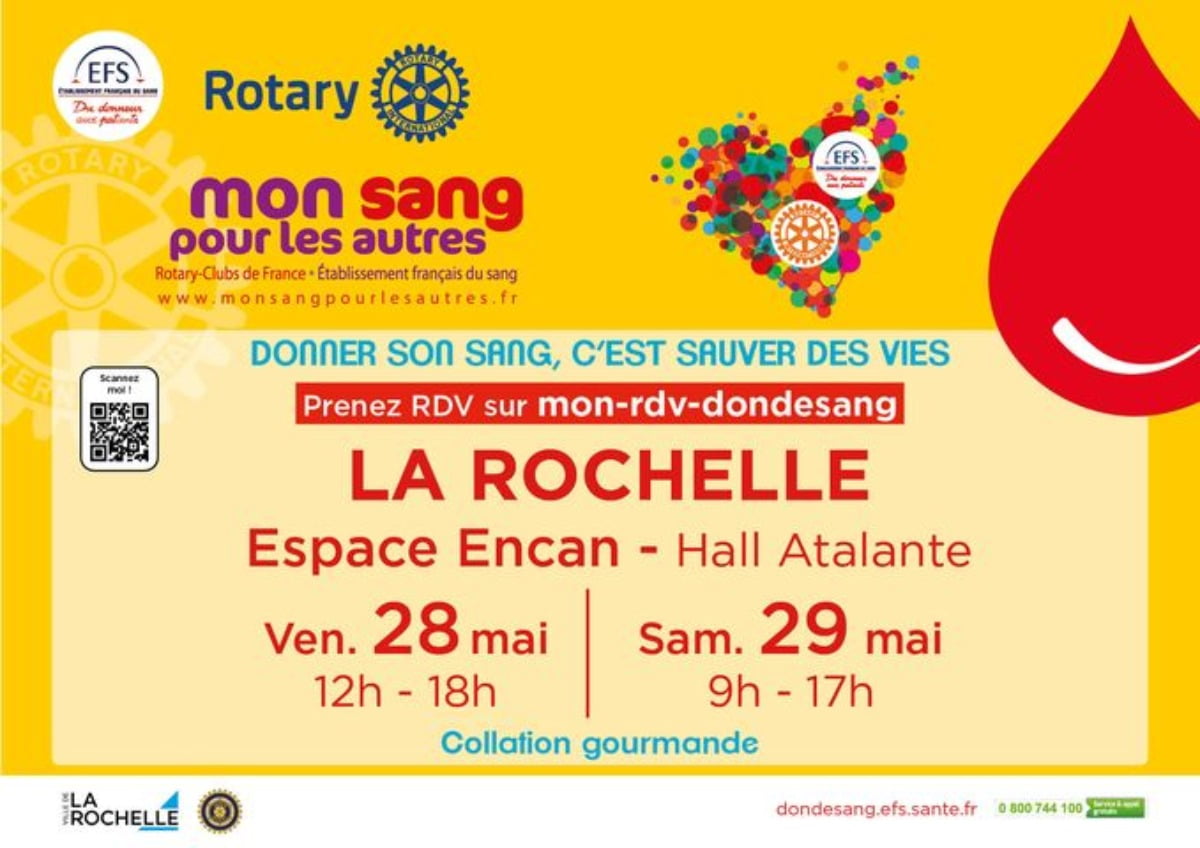 L’Etablissement français du sang (EFS) organise une collecte de sang sur rendez-vous à La Rochelle vendredi 28 mai, de midi à 18 heures, et samedi 29 mai, de 9 heures à 17 heures.