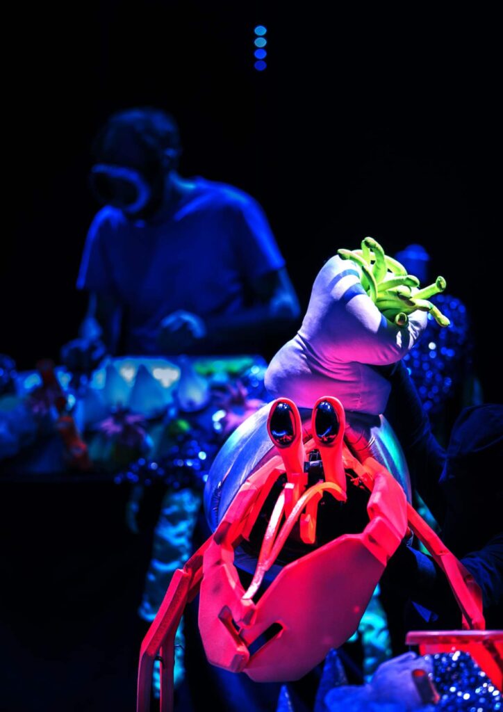 Sur scène apparaissent des marionnettes aux morphologies étonnantes : coquillages étincelants, anémone urticante, crustacés rouge fluo ou planctons bioluminescents. Au cœur du spectacle, les enfants suivent un bernard-l’hermite en quête d’un nouveau refuge. D’abord minuscule, il explore son environnement à la recherche d’une coquille adaptée, croisant des espèces amicales et évitant les prédateurs.