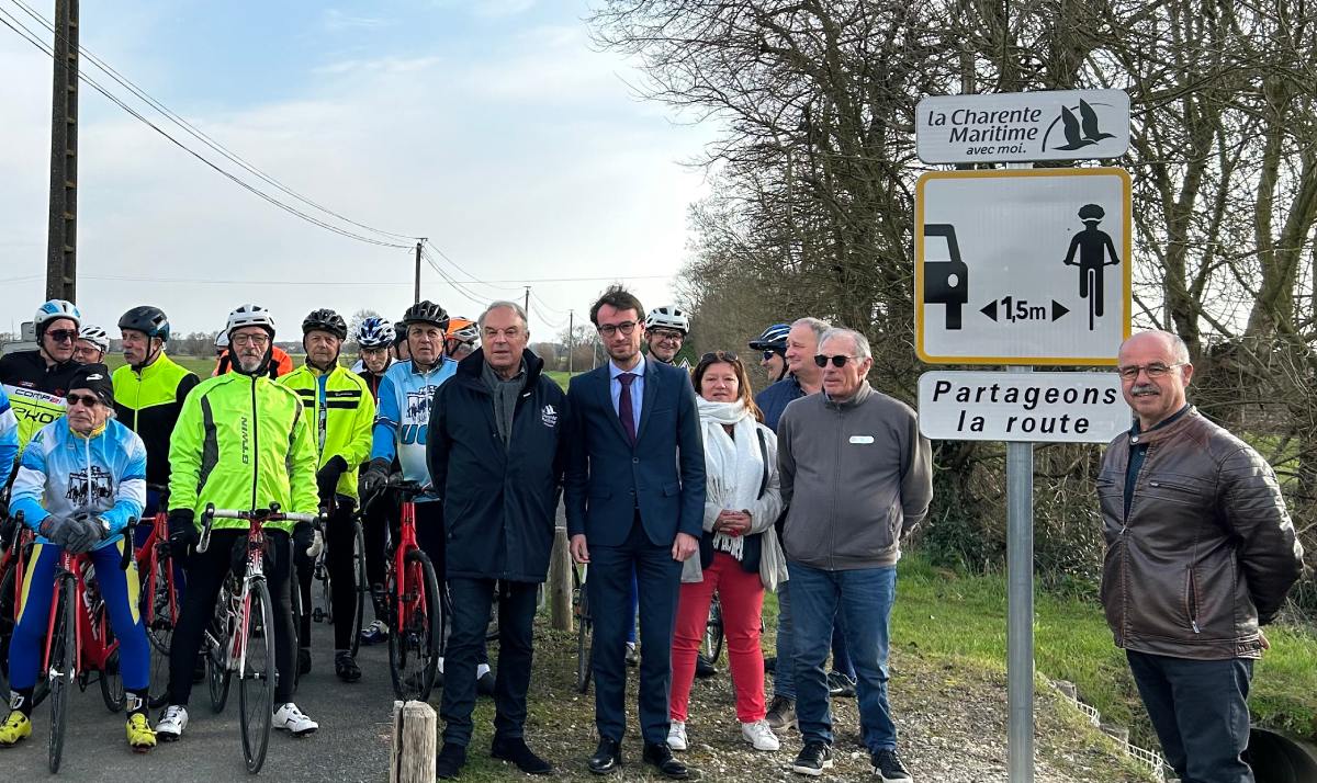 Le Département de la Charente-Maritime et le groupe « Sécurité cyclistes 17 », composé d’associations, de clubs et de fédérations de cyclistes en Charente-Maritime ont travaillé ensemble à la création d’un panneau routier visant à rappeler aux automobilistes la distance de sécurité d’1m50 pour le dépassement des cyclistes hors agglomération.