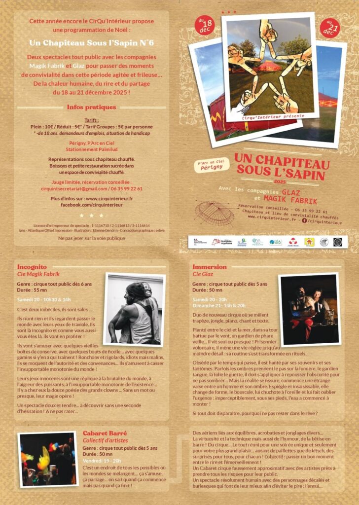 A Périgny, près de La Rochelle; « Un chapiteau sous l’sapin » devrait animer la commune du vendredi 19 au dimanche 21 décembre. Les compagnies Glaz et Magik Fabrik seront à la manœuvre.
