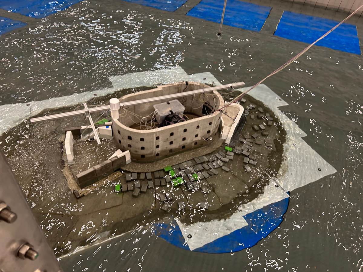 À cet effet, le Coastal & Ocean Basin a conçu et construit un modèle réduit du fort et des futures structures de protection.