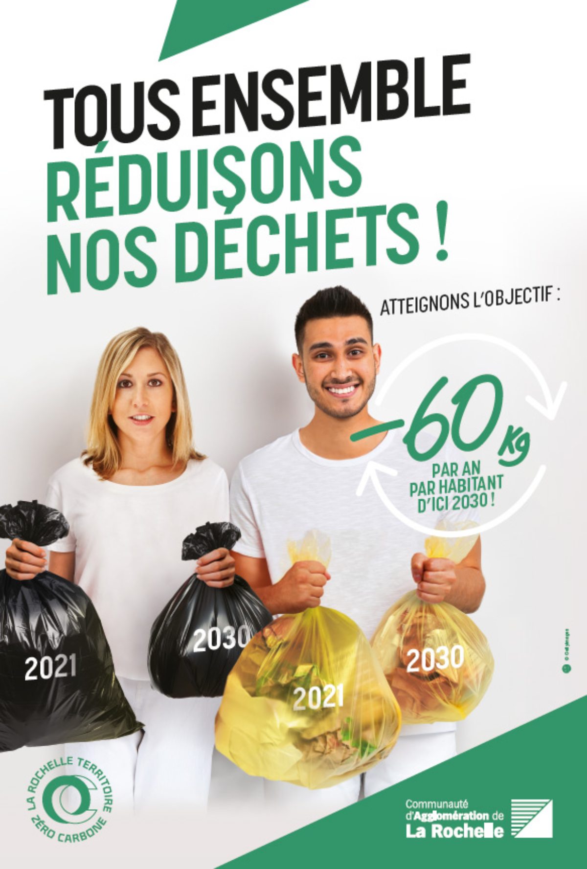 Que dit cette campagbe ? : « Une bonne et une mauvaise nouvelle. Nos poubelles débordent et le traitement des déchets coûte de plus en plus cher, en finances comme en carbone, les ressources de la terre n’étant pas inépuisables. La bonne nouvelle, c’est que nous y pouvons quelque chose ! Quelques gestes et réflexes simples alliés à de nouveaux équipements installés sur le territoire nous permettront d’atteindre collectivement un objectif de moins 60 kg de déchets par habitant et par an d’ici 2030. »