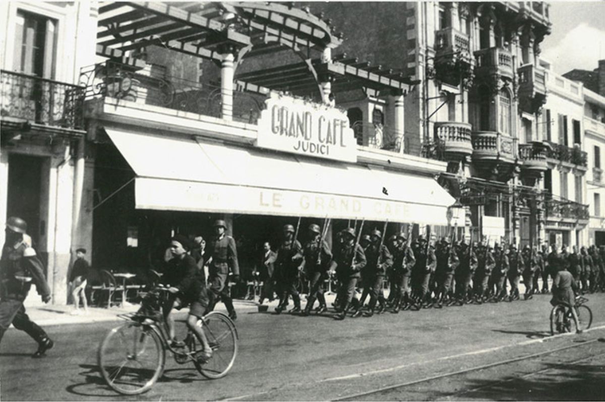 Photo : Troupes allemandes devant le Grand Café Judici, sans date, photographie, auteur inconnu, ADCM 87 Fi Photographies