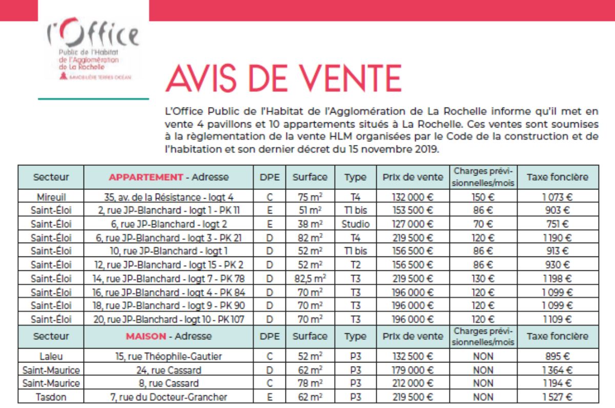 L’Office Public de l’Habitat de l’Agglomération de La Rochelle met en vente quatre pavillons et dix appartements situés à La Rochelle.