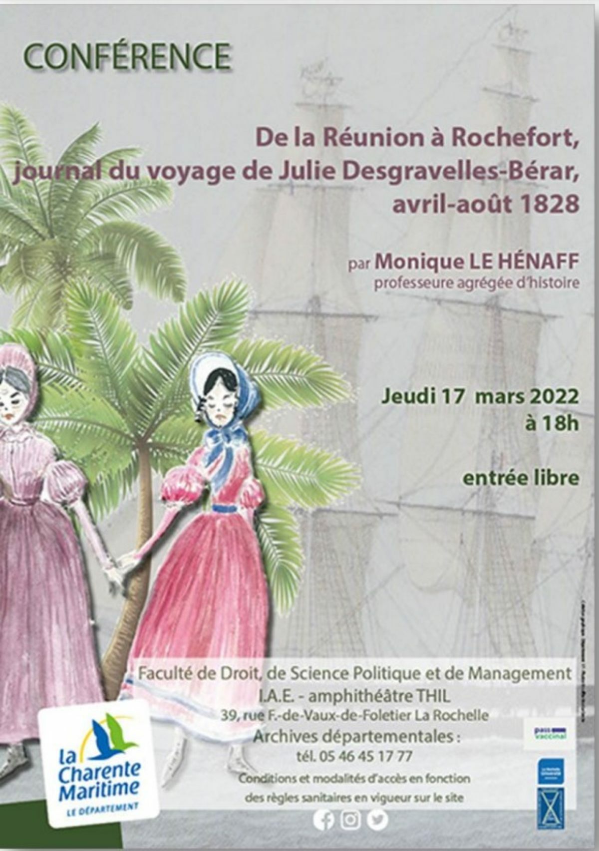 Les Archives Départementales organisent jeudi 17 mars, à 18 heures, à l’Université de La Rochelle, une conférence intitulée « De la Réunion à Rochefort, journal du voyage de Julie Desgravelles-Bérar, avril août 1828. »