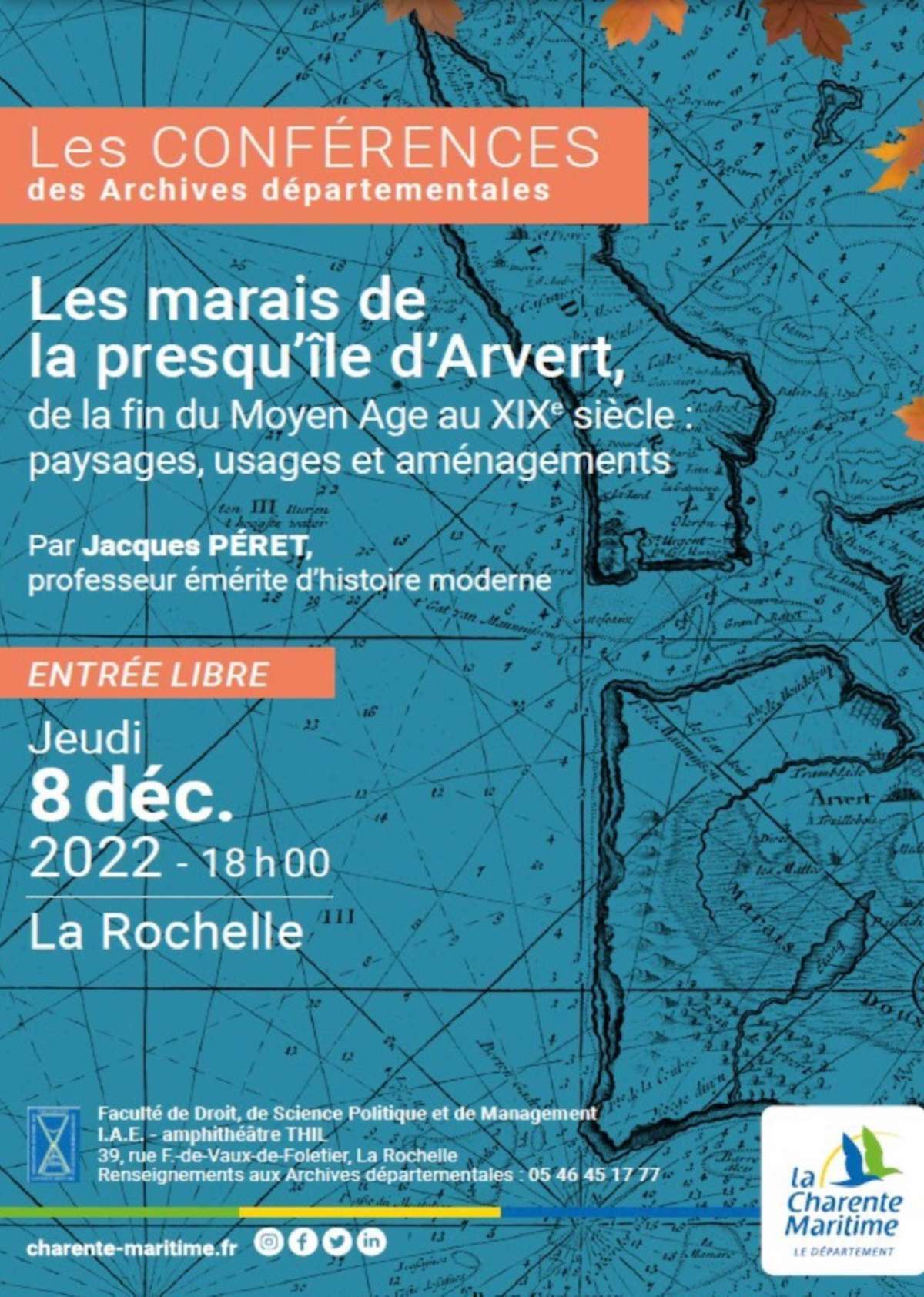 Les Archives départementales proposent jeudi 8 décembre 2022 à 18h00, sur le site de La Rochelle, une conférence intitulée : « Les marais de la presqu’île d’Arvert ».