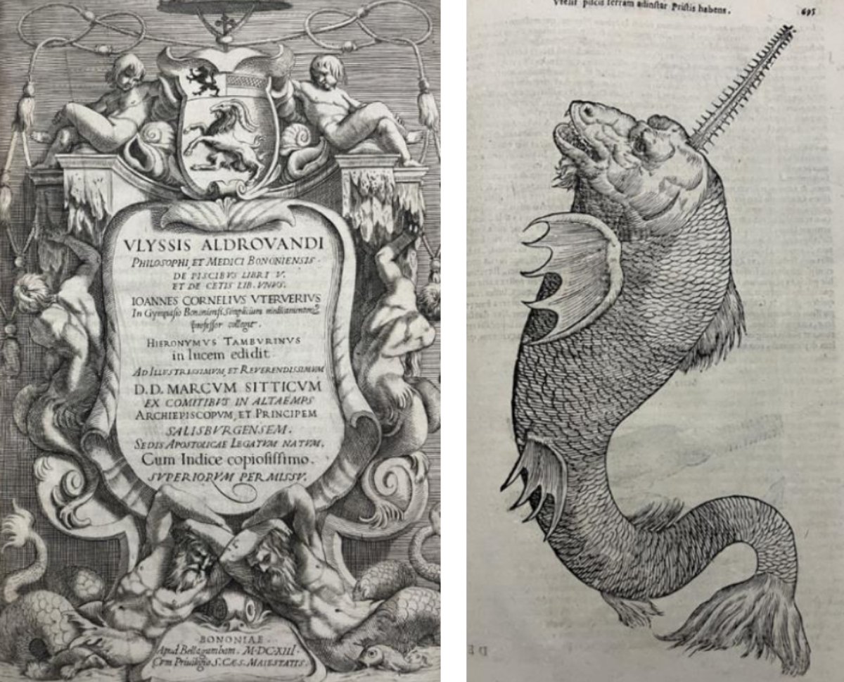 A gauche : De piscibus, Ulisse Aldrovandi, Frontispice. 1613 – Collection Bibliothèque scientifique du Muséum de La Rochelle. Acq. 2023. A droite : De piscibus, Ulisse Aldrovandi, p. 695. 1613 – Collection Bibliothèque scientifique du Muséum de La Rochelle. Acq. 2023.