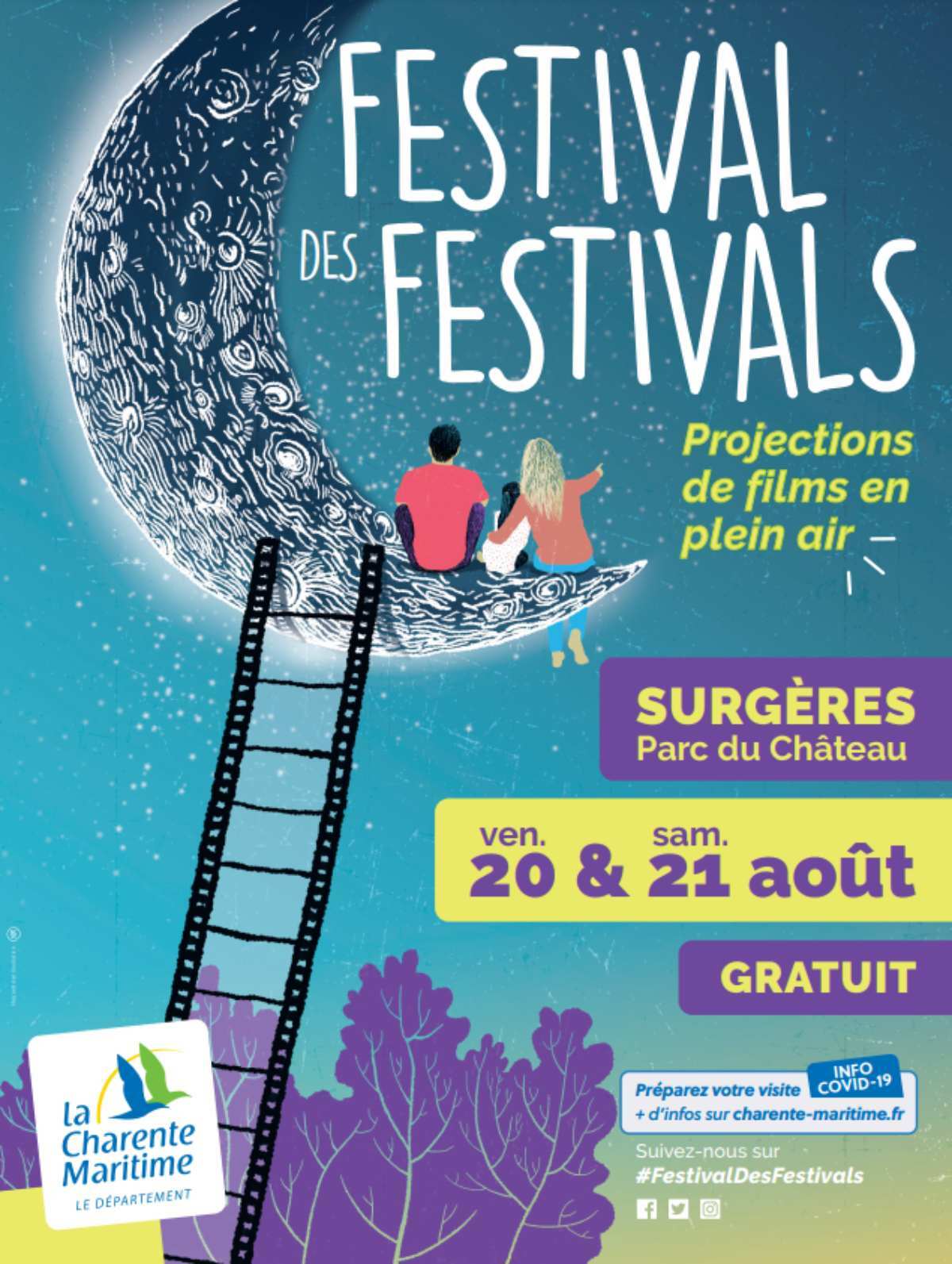 Le département de la Charente-Maritime organise la 5e édition du « Festival des Festivals, projections de films en plein air » les vendredi 20 et samedi 21 août prochain au cœur du parc du château de Surgères.