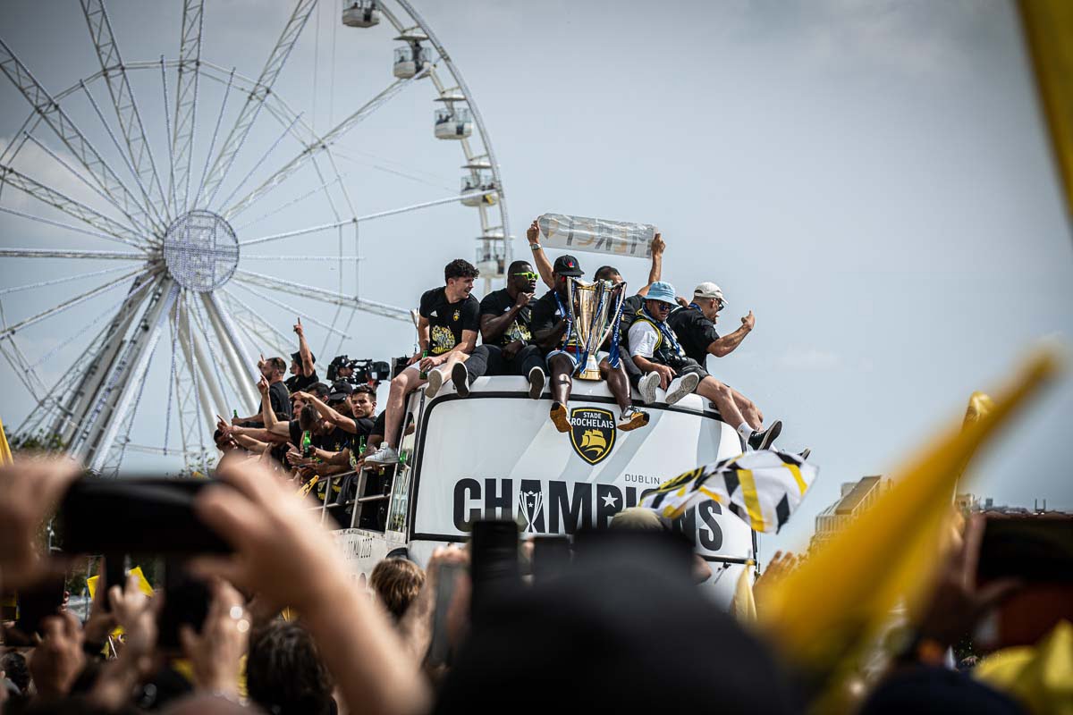 Parti vers 16 h 15 de la gare de La Rochelle, le bus impérial transportant les joueurs du Stade Rochelais, ont lentement pris le chemin du Vieux-Port, s’arrêtant de temps à autre afin de permettre aux milliers de Rochelais et Rochelaises présents ce dimanche en ville, de prendre en photos les héros de la soirée de samedi, et leur précieux trophée.