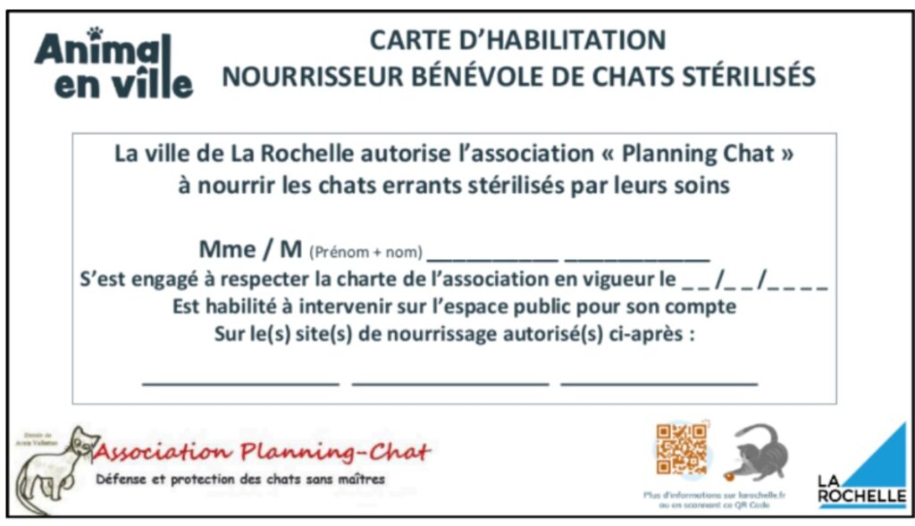 Dans le cadre de cette convention, la Ville de La Rochelle délivre un badge « nourrisseur » à Planning-Chat. Ce badge, nominatif, est estampillé aux logos de la Ville de La Rochelle et de Planning-Chat.