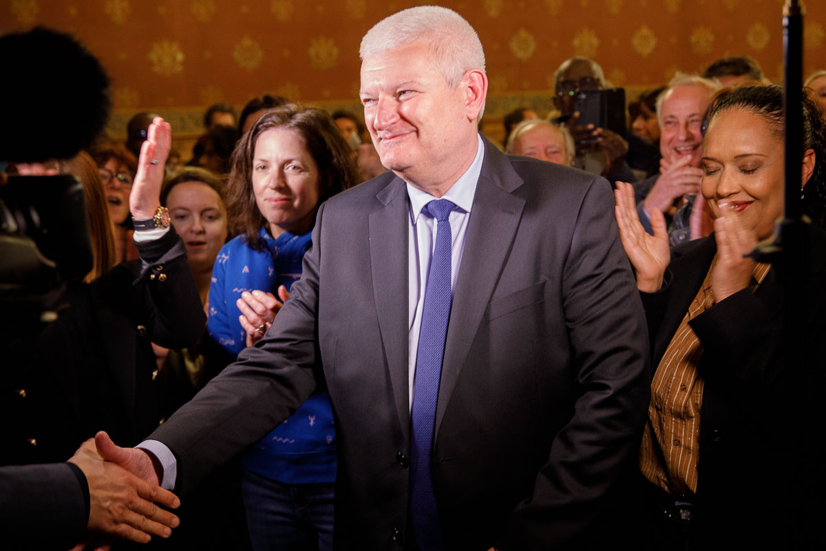Olivier Falorni, en tête avec 33,12%, s’exprime devant la presse à l’hôtel de ville, réagissant aux résultats du premier tour des municipales 2026. Photo La Rochelle info – Amanda BRONSCHEER