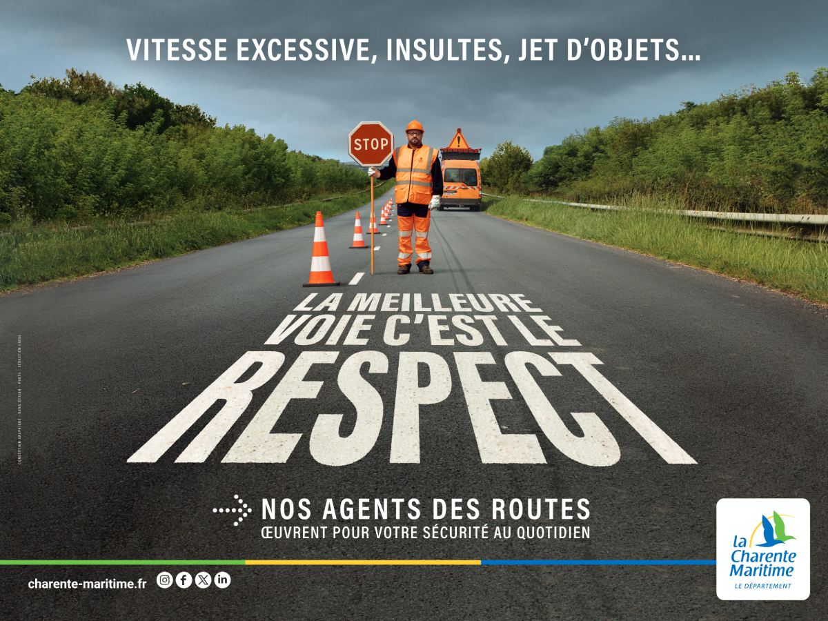 Face à une recrudescence d’incivilités (vitesse excessive, insultes, jets d’objets…) le Département de la Charente-Maritime avait lancé en avril 2024, une campagne de communication afin de sensibiliser les usagers au respect et à la sécurité des agents des routes. Objectif : protéger les 300 agents départementaux qui œuvrent au quotidien sur plus de 6 000 km de route, pour la sécurité de tous.