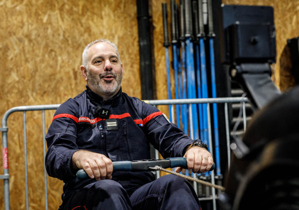 Il est 10h du matin et les bénévoles sont en plein préparatif pour ces 24h en faveur du Téléthon. Le lieutenant Ludovic Lamiau est le premier sapeur pompier sur les lieux, alors… on lui a demandé une petite démo de rameur !