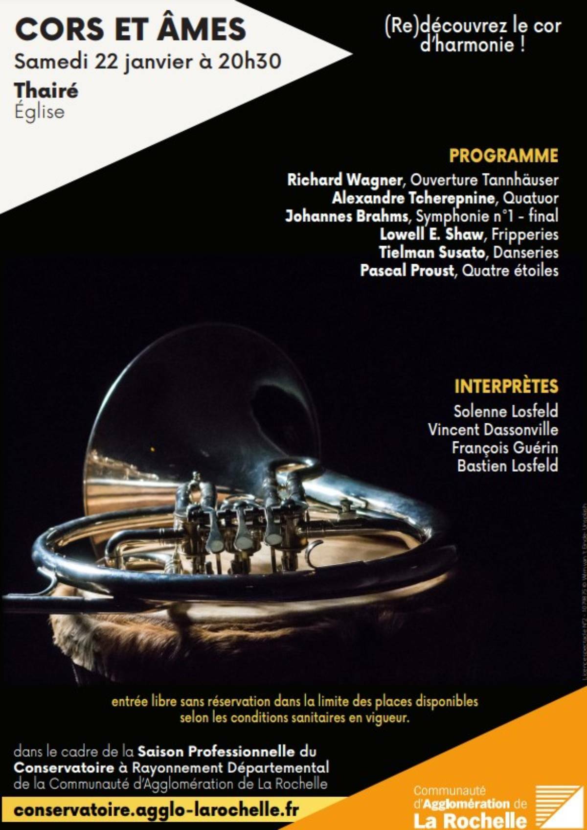 Le concert Corps et âmes propose un répertoire riche et varié d’œuvres originales, de transcriptions et de musiques de films, joué par un quatuor d’amis cornistes : Solenne Losfeld, Vincent Dassonville, François Guérin et Bastien Losfeld.