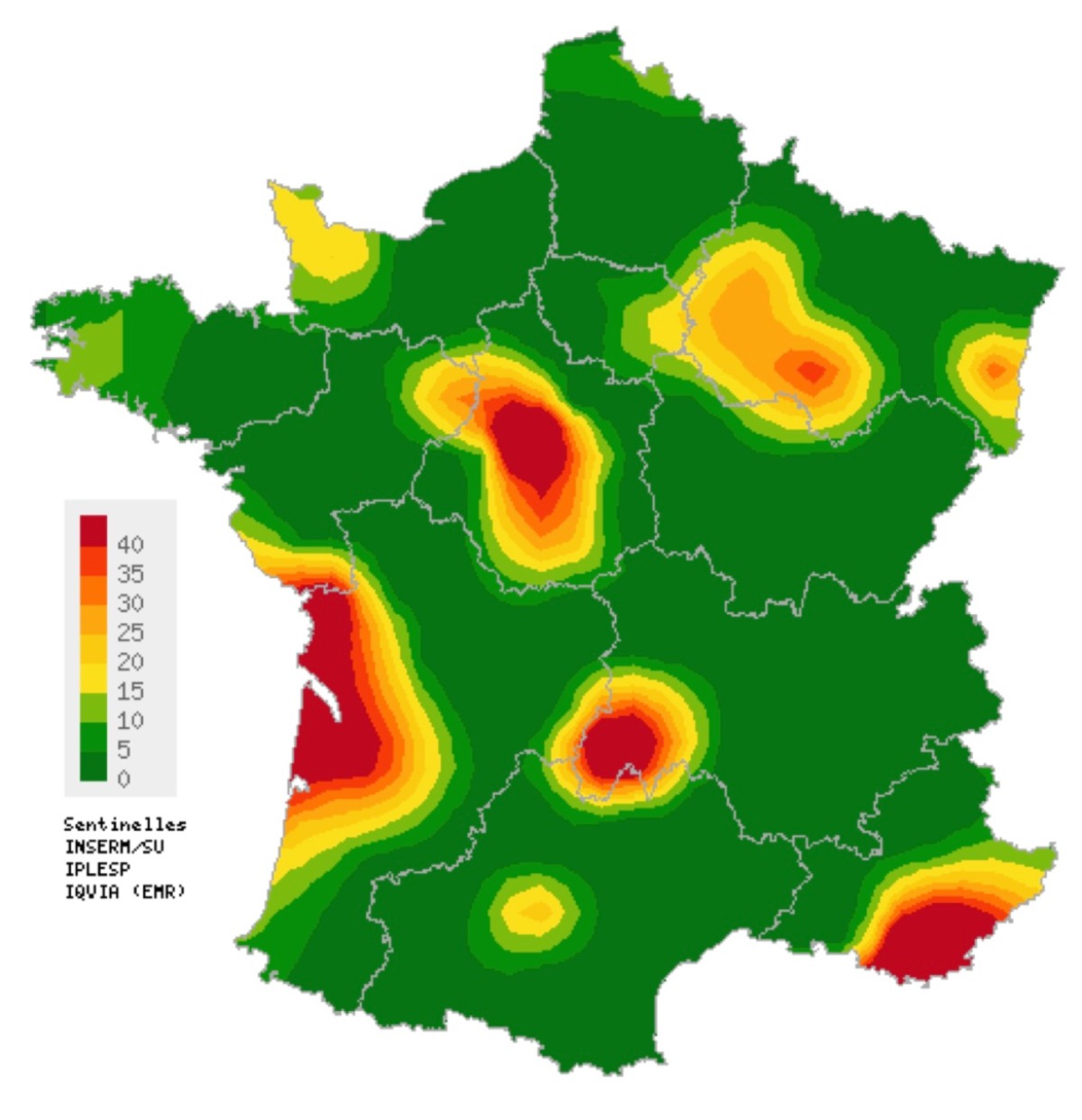 « Sous réserve de la consolidation à venir », indique site, « ce taux est stable par rapport à la semaine pcédente », à l’exception, comme l’indique cette infographie, dans les départements de la Charente-Martime et de la Gironde, notamment. Le nombre de cas détectés est deux fois plus important.