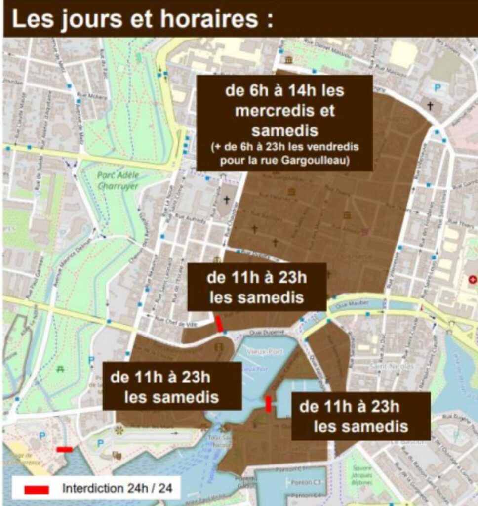 Secteur de l’Hôtel-de-Ville et rues commerçantes Les samedis de 11h à 23h : rue Bletterie, rue des Gentilshommes, rue de l’Hôtel-de-Ville (hors place de l’Hôtel-de-Ville), petite rue du Port, rue du Port, rue Saint-Sauveur, rue du Temple.
